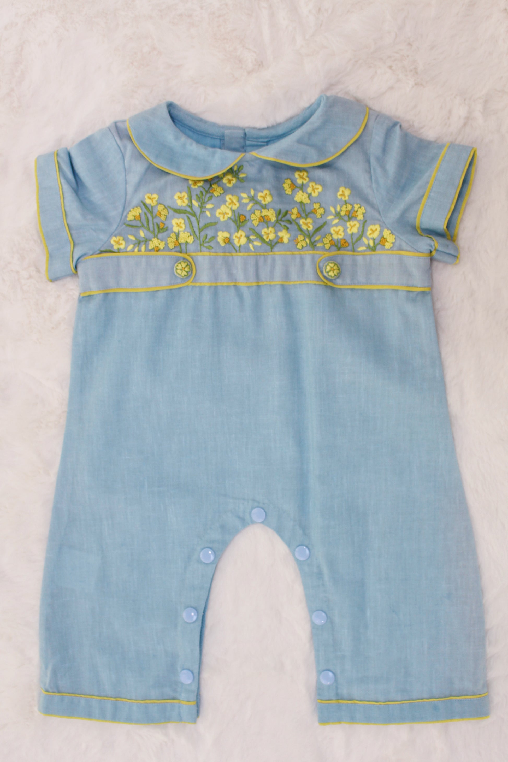 Its yoke is hand-embroidered with tiny yellow blossoms—joyful, sunlit, and full of childhood charm. The contrast piping and buttoned belt detail add a vintage touch, bringing the artistry of heirloom clothing into a silhouette that’s easy for modern parents.