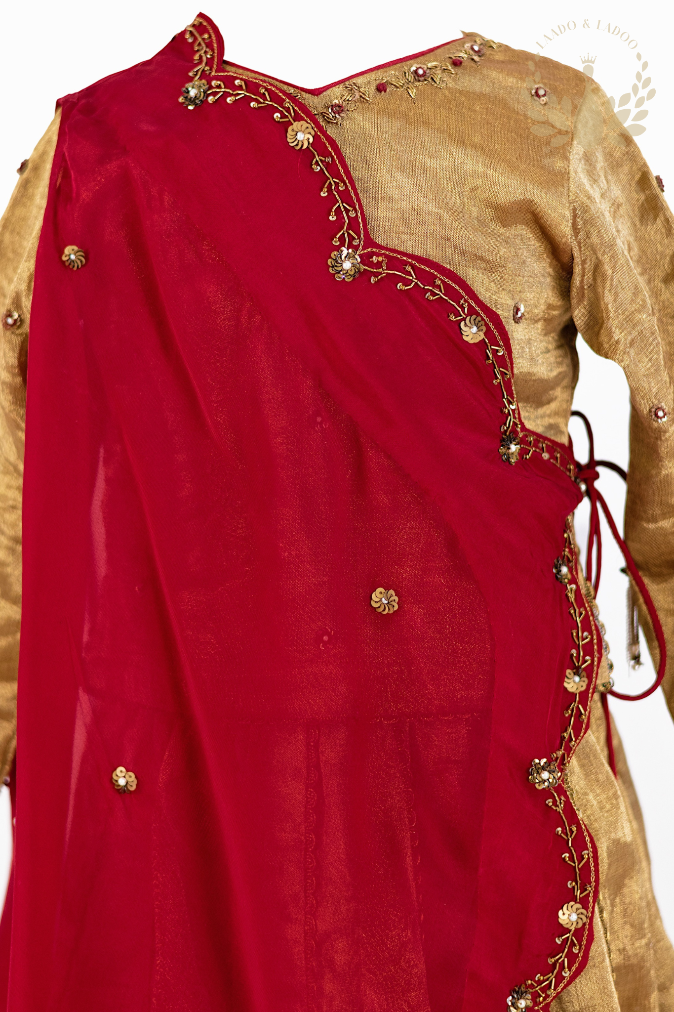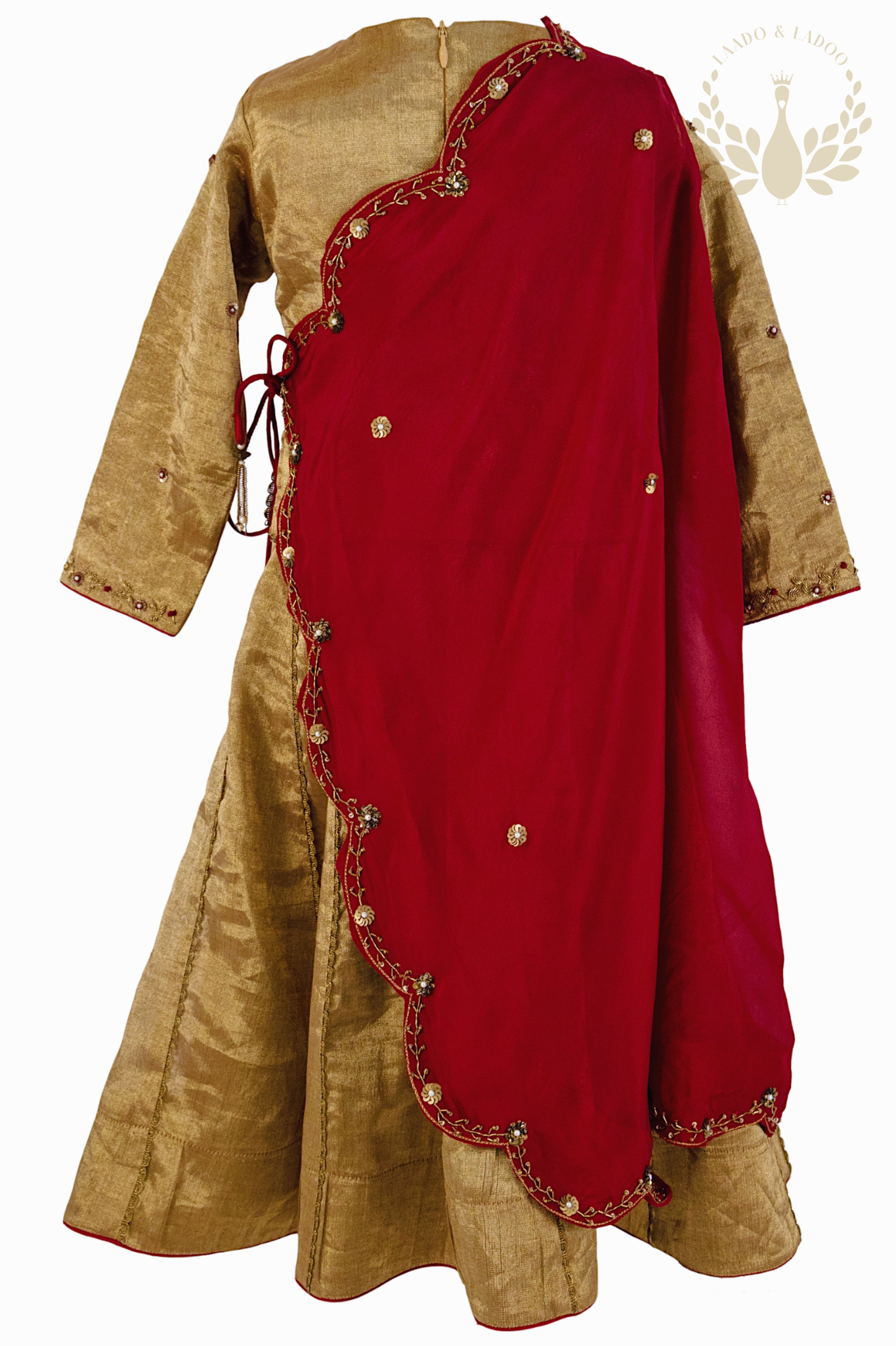Unveil Kanak, our radiant lehenga set, a homage to enduring opulence. Fashioned from luxurious handloom tissue in radiant gold, adorned with intricate zardozi and aari embroidery. The metallic fabric dances with each movement, while the innovative cape-style dupatta provides comfort and grace. Kanak encapsulates regal elegance with youthful charm.