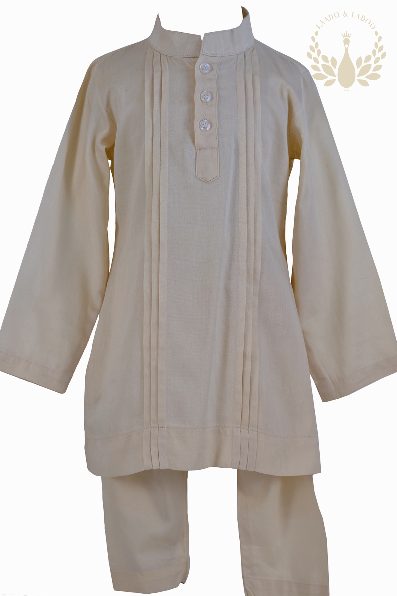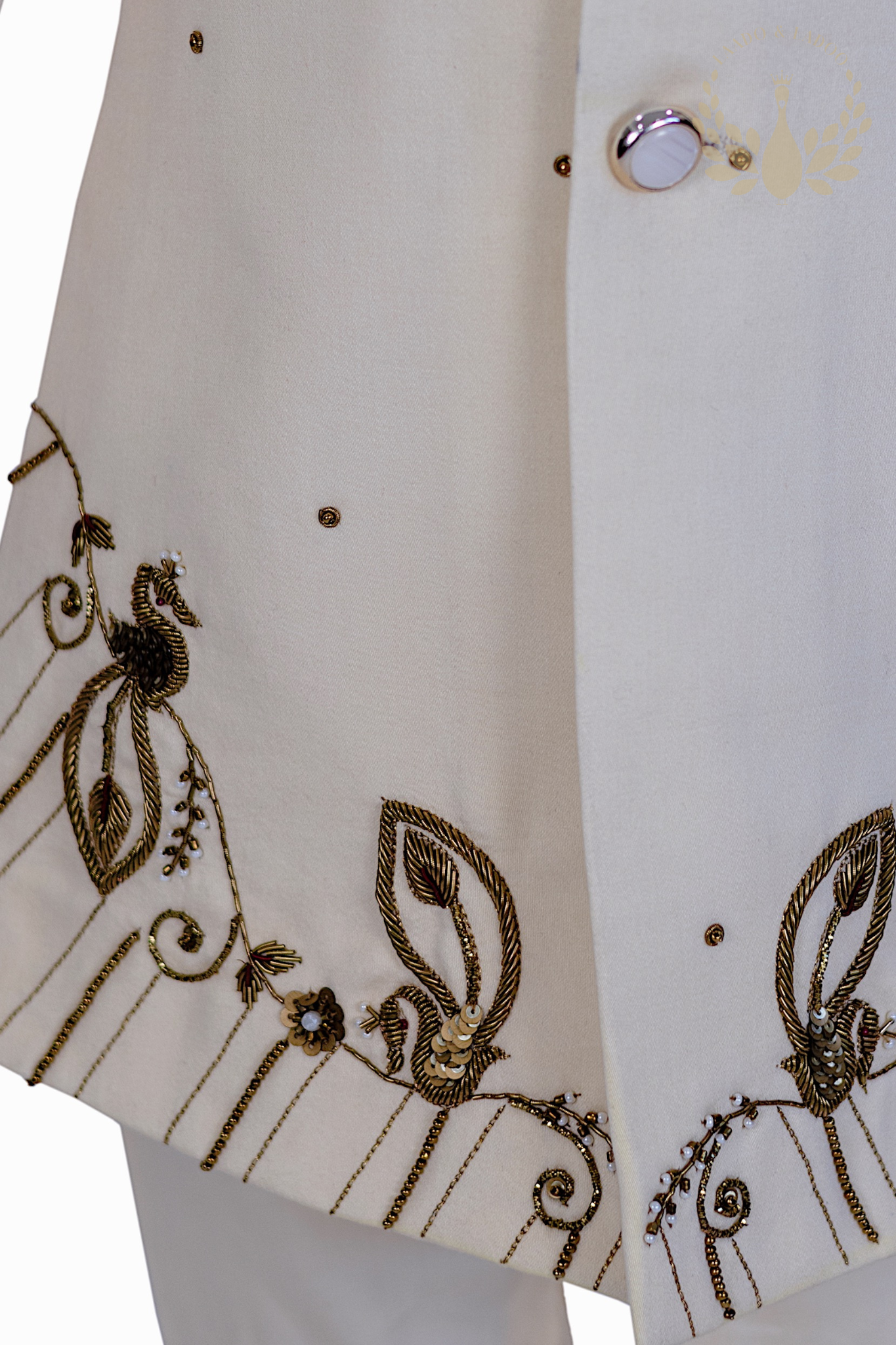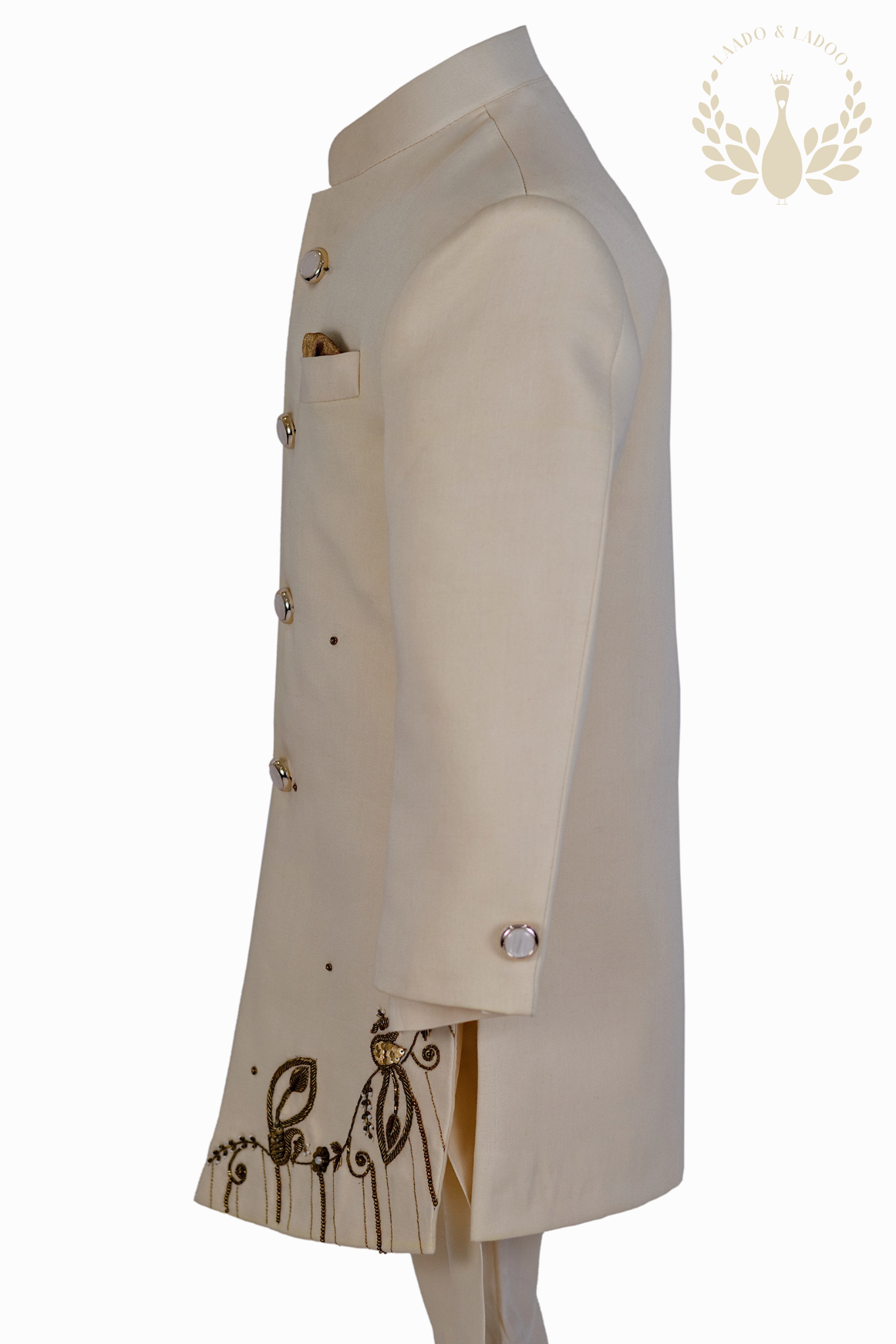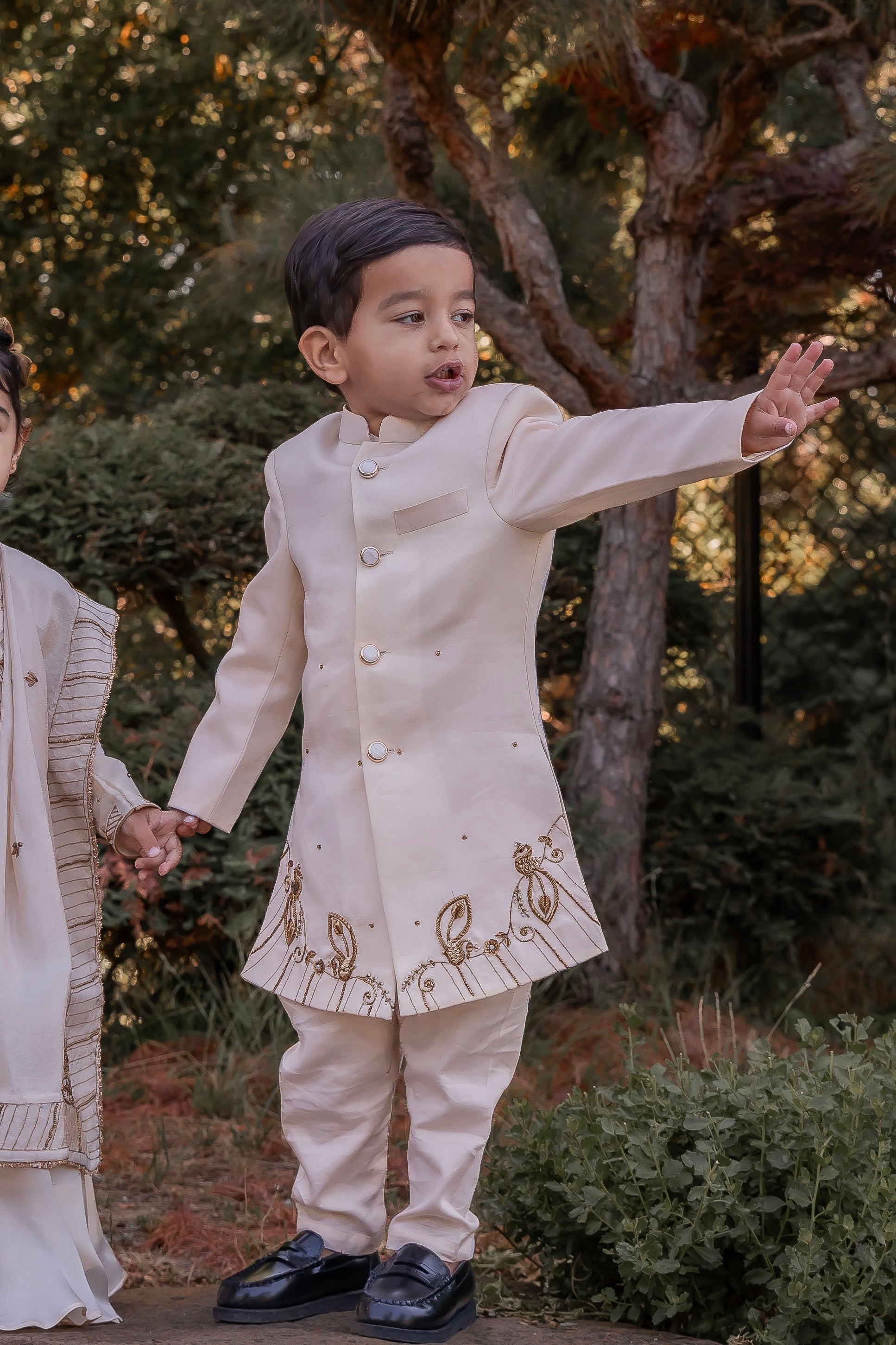 Adorn your prince in this timeless Noor sherwani of luxurious cotton satin and intricate zardozi and aari hand embroidery, featuring beautiful peacock motifs. The structured fit with the comfortable kurta and chooridaar is perfect for any special occasion, ensuring your little prince looks and feels like royalty. What could be more magical?