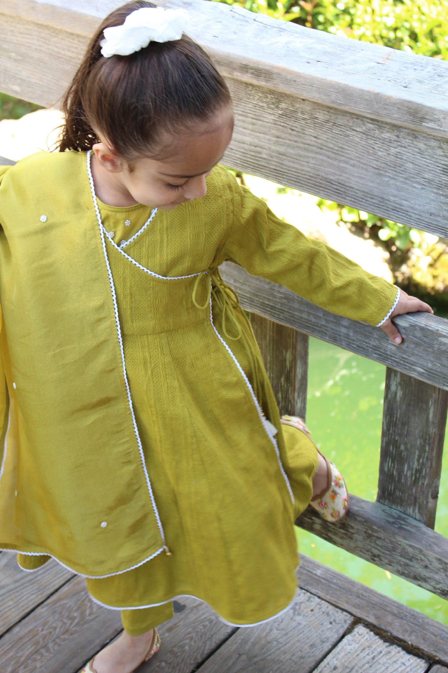 Double the comfort, twice the charm. The Pista Peda set features a flowy angrakha in a rich, earthy green, complete with tassels and a sweet flare that’s made for spinning. Underneath? A sleeveless kurta that can be worn solo with matching pants for a lighter, laid-back look. Topped with a tissue dupatta dotted with pearl beads, it’s a clever pick for the girl who loves options and comfort without compromise.