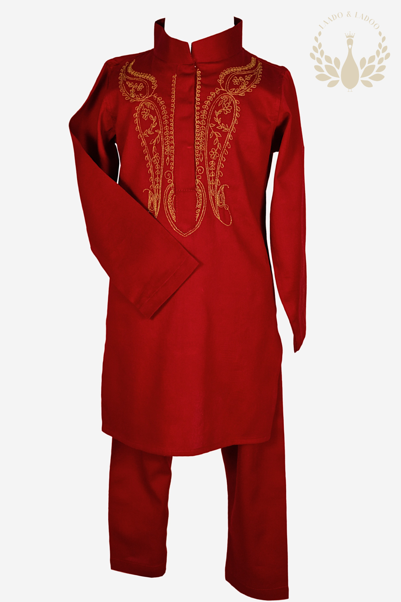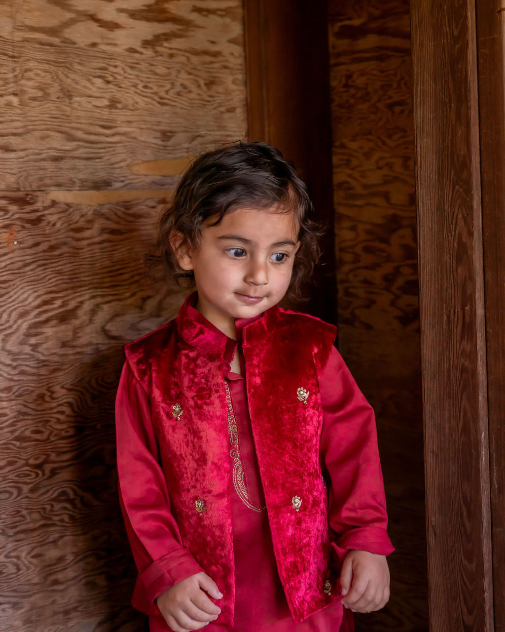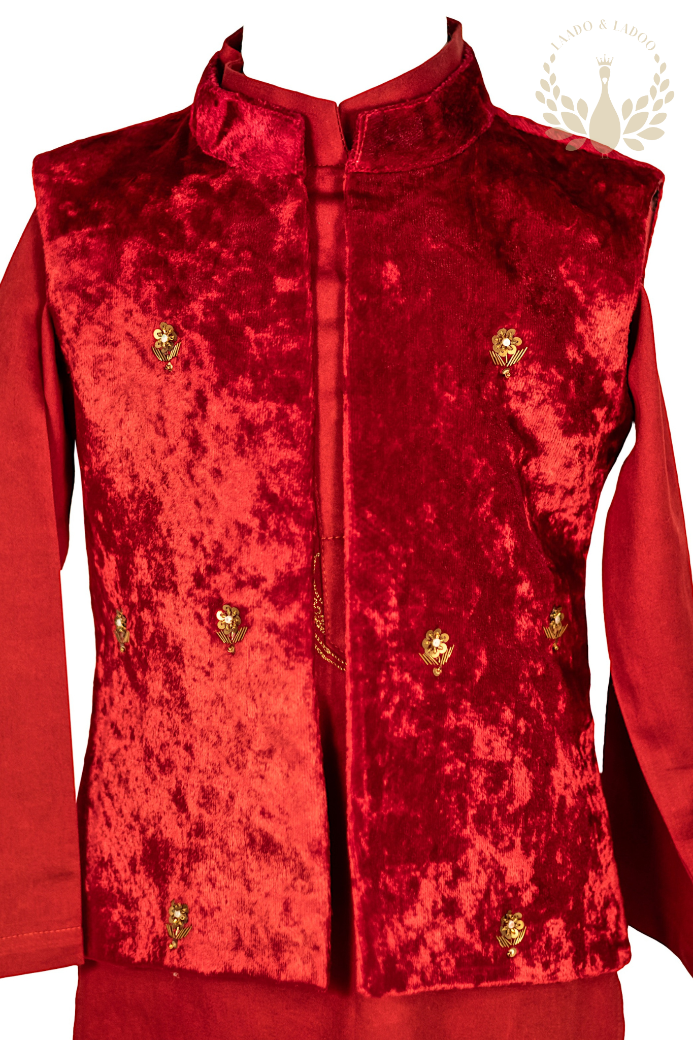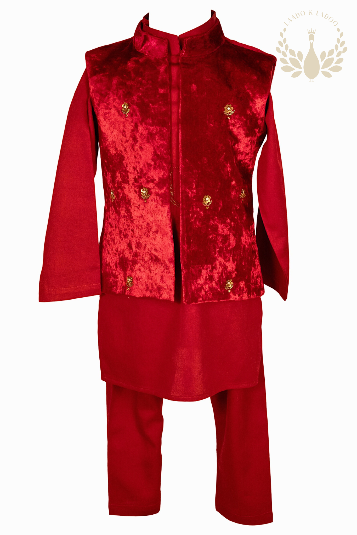Elevate your young prince's style with the Shehzada kurta set. This ensemble exudes regal charm, featuring a red kurta complemented by a velvet Nehru jacket vest. The kurta showcases intricate golden aari embroidery across the neck and chest, radiating elegance. The velvet vest boasts zardozi and aari hand embroidery, adorned with delicate flower motifs, adding a touch of opulence fit for royalty. A perfect blend of tradition and sophistication, Shehzada captures the essence of princely grace.