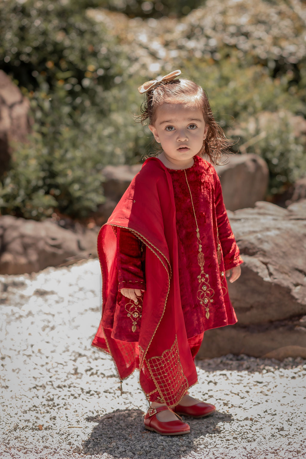 Step into a world of modern enchantment with Surkh Pari. The kalidaar kurta, adorned with exquisite zardozi and aari hand embroidery, weaves a tale of elegance in radiant red hues. The organza dupatta flaunts coordinating embroidery, adding to its ethereal charm. Even the pants shimmer with embroidery along the hems, creating a symphony of intricate details. A fairy-tale ensemble where dreams come alive in the enchanting hue of Surkh Pari.